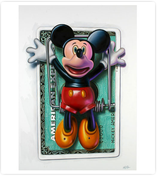 It’s been a long time since the release of Tara McPherson’s Lilitu figure, so it came with great pleasure to find out that Kidrobot Black‘s latest release, Ron English‘s “American Depression” will be dropping at the end of the month! Fitting the more-art-than-toy brief of Kidrobot‘s super sleek subsidiary, the piece has been adapted from a painting English did back in 2008. Depicting the economic crisis in a way only he know’s how, the figure features the amalgamation of two American icons- Mickey and the American Express card, with the mouse helplessly pinned to the credit card as if it were trap! The sculpted version appears a lot fatter- maybe a sign of the times? We’re guessing it probably has more to do with legal issues… Set for release on May 29th, expect to find “American Depression” exclusively on the Kidrobot Black site and at select Kidrobot stores.