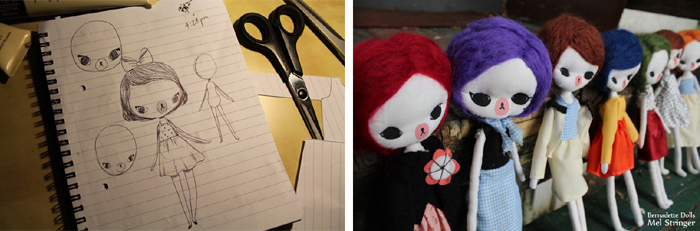 Australia based illustrator and visual artist Mel Stringer kindly shares with us her latest designer plush, the “Bear-girl” Bernadette dolls! Created for the upcoming BrisStyle Twilight Markets (May 25th, King George Square), these beautiful hand made figures stand at an impressive 11″ tall. Limited to just 7 pieces at the moment, the creepy-yet-cute dolls are available to purchase directly from Mel at perfectnoseclub@gmail.com (price undisclosed). Head over to her site here for more info and pics on this enchanting series…