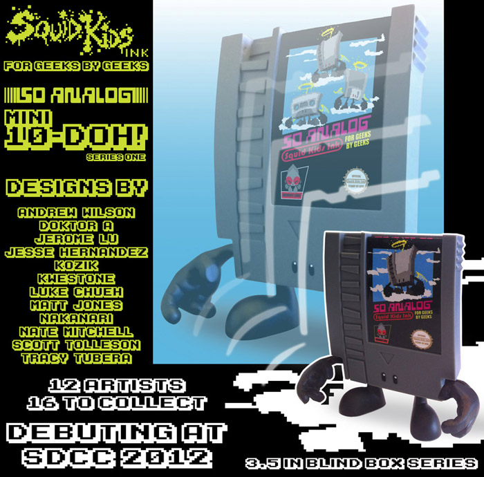 Originally previewed back at last month’s Wondercon, Squid Kids Ink are proud to officially announce their first blind-boxed series, Mini 10-Doh! Scaling the much loved 10-Doh! NES styled cartridge down to a dinky 3.5″, the first series is set to feature designs by Andrew Wilson, Doktor A, Jerome Lu, Jesse Hernandez, Kozik, Kwestone, Luke Chueh, Matt Jones, Nakanari, Nate Mitchell, Scott Tolleson and Tracey Tubera. Dropping with 12 grey designs plus an extra 4 gold chases, expect to see these awesome figures debut at SDCC 2012. Stay tuned for design reveals over the coming weeks…