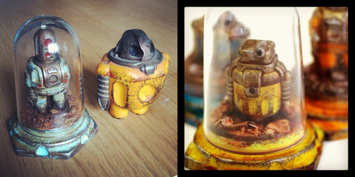 Anyone following the newly opened Cris Rose Instagram account will have noticed several interesting photos from his latest project, the Trimensional Viewers! Little is known about the project yet, but as you can garner from the above shots, the release is set to feature a scaled down version of Cris’ popular Sprog bots (around 2/3 the size), housed in a beautiful clear dome and suitably weathered base. No news as of yet with regards to pricing or edition size, but expect these wonderful resin creations to hit the Cris Rose store at some point this week.