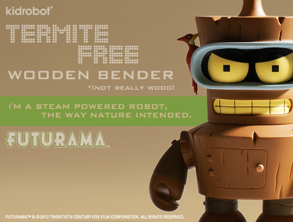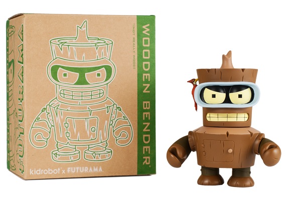 “Futurama’s Wooden Bender 6-inch vinyl figure is here and officially downgraded! Complete with removable red woodpecker and “technology-free” stumpy head and body, Wooden Bender is 6 inches tall and designed with the Kidrobot aesthetic twist, making this primitive vinyl ‘bot feisty and termite-free.” -Kidrobot press