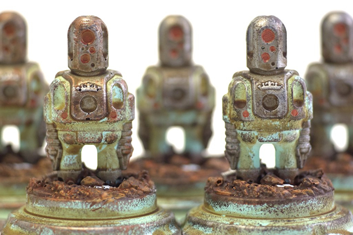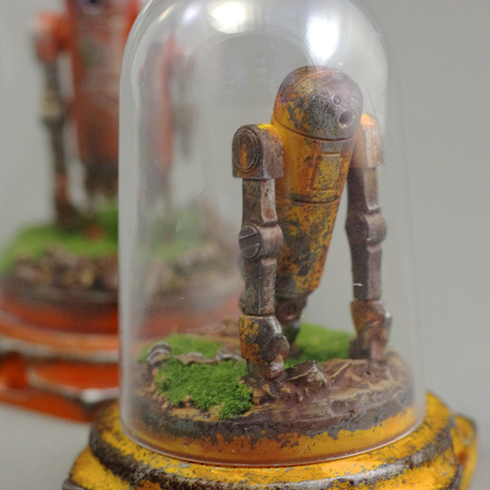 As previously revealed last week, the first round of Cris Rose‘s Personal Trimensional Viewer’s, the Turquiose Rotund Mk2, are set to land in his store tonight (May 21st). Using the miniature Sprog platform “Bits and Bytes”, Rose has created intricate hand cast mini-dioramas that house the expertly painted figures in an acrylic dome. Priced at $65 plus shipping (the same as a Sprog), the turquoise beauties have been limited to just 5 pieces. Head over to the store at 6pm (London time) sharp, because these little fellas wont be around for long! Expect more limited runs of 3 or 5 in the near future…