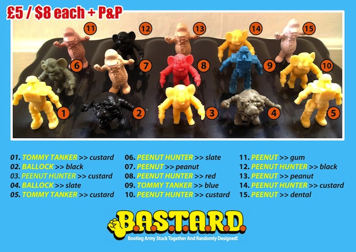 Debuting at the Kapow Comic Con last weekend, the new wave of B.A.S.T.A.R.D’s from Triclops Studio were an instant success, and whilst most were snapped up, the guys have revealed that a select few are still available to purchase. Featuring the newly created PeeNut Hunter alongside resurrected characters PeeNut, Musclito (sold out), Tommy Tanker, and of course, Ballock, the 1.5-2″ tall M.U.S.C.L.E customs have been cast in a wide selection of tinted resins, including yellow, green, black, pink and blue. Priced at just £5 each plus shipping, send an e-mail directly to info@triclops.co.uk with the corresponding numbers for the figures you’d like. Be quick, as there are only 15 in the current batch left!