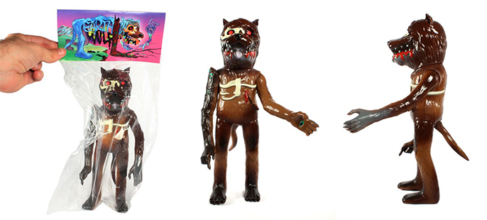 Coinciding with his latest solo show entitled “Fungus Amungus“, San Francisco based artist Josh Herbolsheimer will be releasing the Rotofugi exclusive Earth Wolf sofubi. Translating Josh’s signature mis-matched aesthetic and dark kaiju style perfectly, the disturbing vinyl figure stands at a monstrous 10″ tall. Cast in brown/dark brown vinyl, with grey sprays and tan, green, red and black accents, Earth Wolf will be available at the show’s opening today (June 1st), with any remaining hitting the Rotofugi store on Monday (June 4th) for just $150 each…