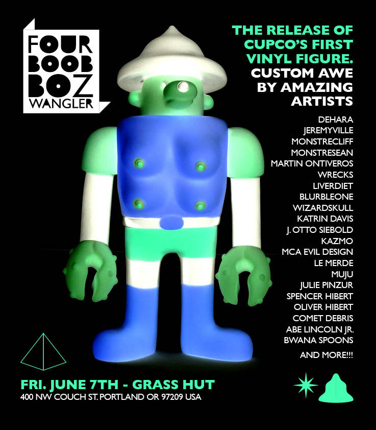 Infamous for his unique hand stitched creatures and super-creepy busts, felt artist Cupco is proud to present his first foray into vinyl with the release of the Four Boob Boz Wangler! Based on his signature uddered dog character, Cupco will be celebrating the Wangler’s launch with a custom show at the Grasshut featuring some of the scene’s biggest artists including Dehara, Monstrehero, Liverdiet, Le Merde and of course, Bwana Spoons. No news on edition size, pricing or colourways (although inverting the image reveals a pink, yellow and black design!), so stay tuned for more news soon…