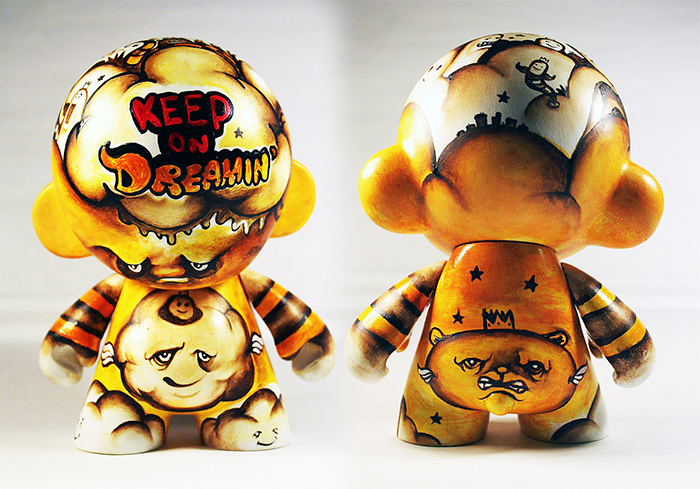Widely known as one of the hottest sculptors in the custom toy scene right now, it’s been great to see JC Rivera get back to his painterly roots for some of his latest work, with his entry for Dream in Plastic‘s upcoming Custom Custom show no exception. Focusing on the store/gallery’s name, Rivera has used the 7″ Munny platform to create a dreamworld for his enchanting characters to inhabit. Featuring a beautiful landscape filled with hills, clouds and Rivera’s worm-esque creatures, the piece is rounded off (quite literally!), with a growling Bearlee on the back side…