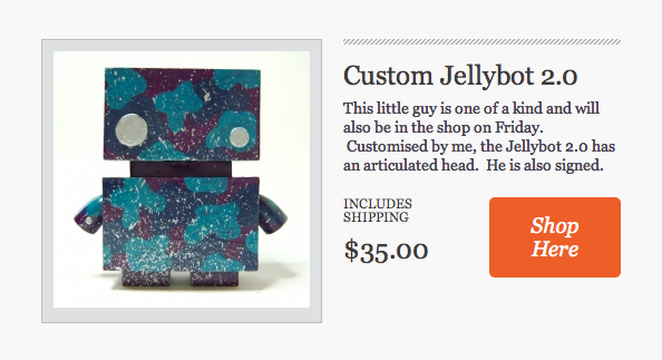 Jelly empress Selina Briggs has revealed that the new Jelly Empire online shop will be opening this Friday (June 8th), stocked to the brim with a whole host of Jelly related goodness! Previously revealed at this year’s MoCCA Fest, the Jellactic Troopers will be leading the way, with 12 hand painted designs (in both red/white and black/yellow) being made available for just $30 each- shipping included! Joining the Troopers, Selina has also prepared yet another stunning one-off Jellybot using the newly refined 2.0 design. Priced at $35, the signed aqua-camo piece will be landing alongside a huge selection of prints, badges and t-shirts tomorrow at 9pm EST…