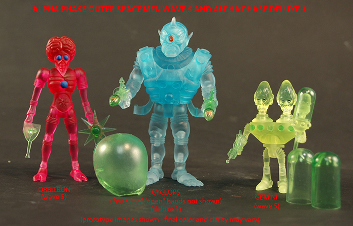 CYCLOPS – The Four Horsemen’s very first “deluxe” Outer Space Man, not only is Cyclops massive compared to the other Outer Space Men, but he comes decked out with a whole host of goodies! Due to be cast in a clear light blue plastic with clear green ABS accessories, his chest/back armor and inner helmet are fully removable so you can create a completely different looks for the character. He also features another set of “open” hands which aren’t shown in the image above…