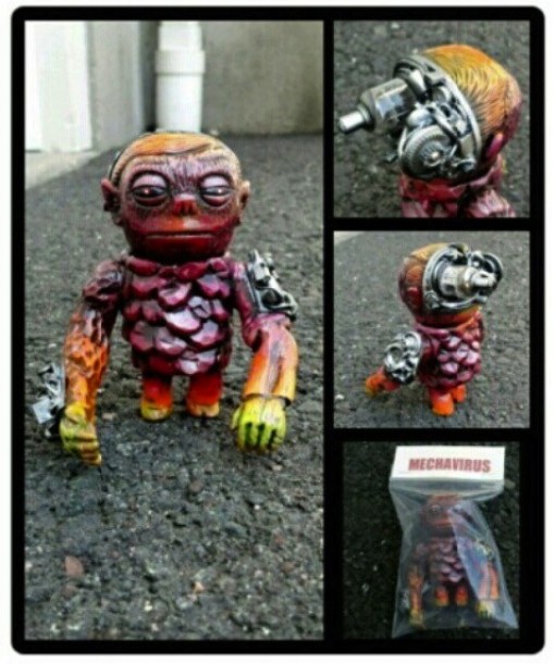 Fresh from his FOE exclusive Ammonaito release (find out more here), Todd Robertson aka Mechavirus shares with us his latest organic/mechanic infusion, the breathtaking Mecha Monster Kara! Created from the body parts of the Monster and Karakuri sofubis, Todd has seamlessly melded his signature mix of cogs, motors and fuses to create one of the strongest Grody mash-ups yet! Coming painted in flame fades and finished with a black rub, the 5″ custom was available for just $80… unfortunately (for us!), this guy is already winging his way to one lucky collector as we speak… On the upside, Todd assures us that he has a lot more planned in the coming months, so stay locked for more info as soon as it hits!