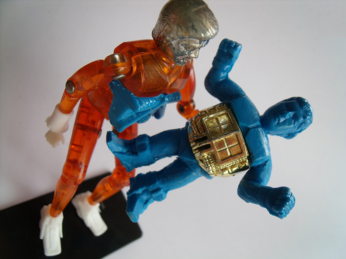 Micro-Keshi// Easily our favourite of the trio, Micro-Keshi combines Bigman’s love of Micronauts and M.U.S.C.L.E with flair. Based on the Time Traveler design, the figure comes with a TT head, boots, and the best part… a removable chest plate than can be interchanged with the original toys! A truly brilliant mash-up…