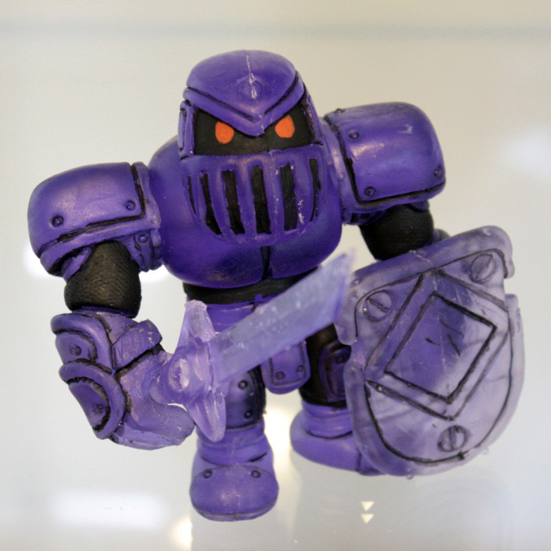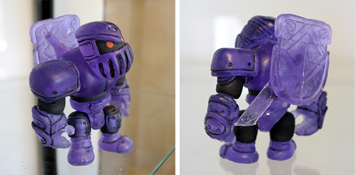 It appears that alongside the recently featured Monster Farm (find out more here), Blackgard have been hard at work on an another awesome resin, the fearful knight “Ironheart”! Making his debut alongside the Locomans, Krog and Blockman at last week’s Ottawa Comic Con, the stunning 3.5″ figure has been lovingly hand painted with a mixture of brush and rub work, coming complete with removable sword and sheild that can be mounted on the knight’s back! The exclusive clear purple colourway shown above unfortunately (for us!) sold out in a matter of hours at the con, so we’re keeping our fingers crossed this isn’t the last we see of this stunning piece… Stay tuned for more info and be sure to head over to the Blackgard site to check out the latest on the Monster Farm, plus their upcoming iPad game KROG!