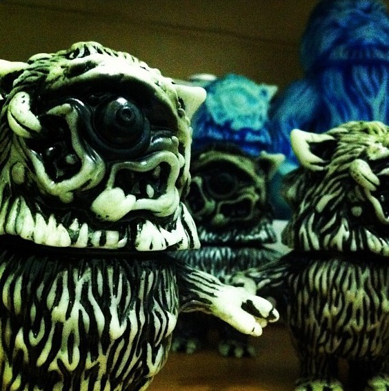 Hot off the heals of his recent collaboration with Uamou, Jon Malmstedt has revealed that he will be dropping the latest batch of Rampage Toys x Splurrt customs as soon as next week! This time around featuring the recently released Forrest Diggler, Jon has set to work on a number of glow-in-the-dark casts, giving the stunning sofubi mini a much needed black rub… the shot above is still a work in progress, so you can guarantee that these guys will be finished with the painstaking brush work Jon’s famed for. No news on exact pricing or edition size ( although a conservative guess based on Jon’s recent studio pics would suggest 10), so be sure to stay tuned this week as we bring you more info as soon as it hits…