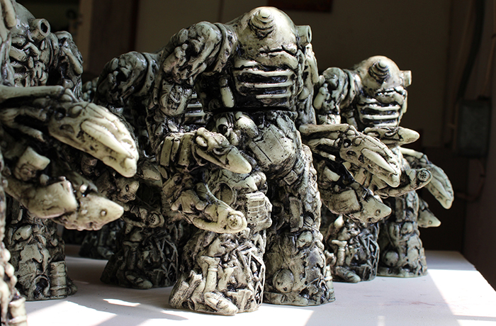 Brian Mahony aka Guumon is putting the final touches to the latest batch of Daigomis, the “Bone Glow” Vicious Fun exclusives! Standing at an impressive 9.5″ and weighing in at 15 ounces, the monstrous kaiju beast has been cast in GID vinyl, coming complete with a pro black rub. The detail in the piece is an absolute joy to behold, and with the lack of the usual neo-kaiju style paint job, the sculpt really comes to the forefront of the design… we had know idea there was so much detail! Unfortunately edition size and pricing are still unconfirmed, so be sure to stay locked on the Vicious Fun site here for further updates…