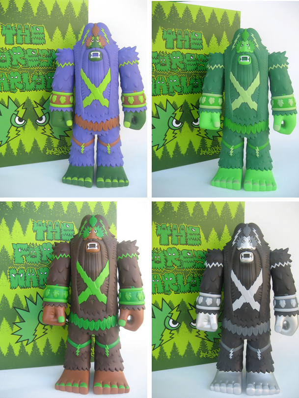 After months of teasers and reveals (plus a limited release at Wondercon ’12), San Francisco based artist Bigfoot is proud to reveal that the mighty Forest Warlord is now available to purchase. Standing at a humungous 11″ tall, the long-awaited follow up to StrangeCo’s 2004 Bigfoot figure comes in 4 marvelous colourways; OG Brown, the Kiss inspired Black and Silver, Green, and our favourite, the psychedelic Purple! Priced at just $95 plus shipping, each edition has been limited to 100 pieces worldwide, with the first batch touching down on the Bigfoot store here last night…