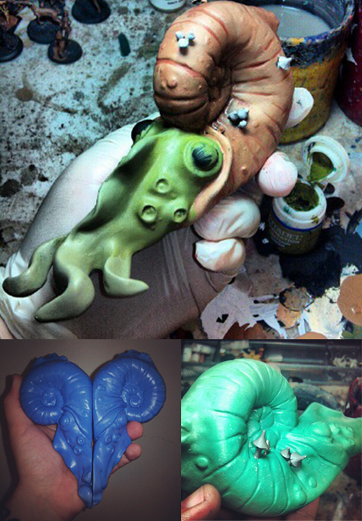 Adam Pratt kindly shares details of his latest two work-in-progress projects, the Mechavirus x Halfbad Ammonaitos and the HateMale custom Munny… One of our favourite resin pieces to emerge from the past year, we were delighted to hear that Adam had finally settled down to work on Todd Robertson’s Ammonaitos, and as you can see from the early shots, he’s doing them every bit of justice they deserve! Initially working on a series of four, two will be customised in the funghi ridden style seen above, whilst the last pair will be grafted together to form the ram-shaped objet d’art piece seen bottom left. These are due to be landing in the Mechavirus store soon, so be sure to stay tuned for more details in the coming weeks…