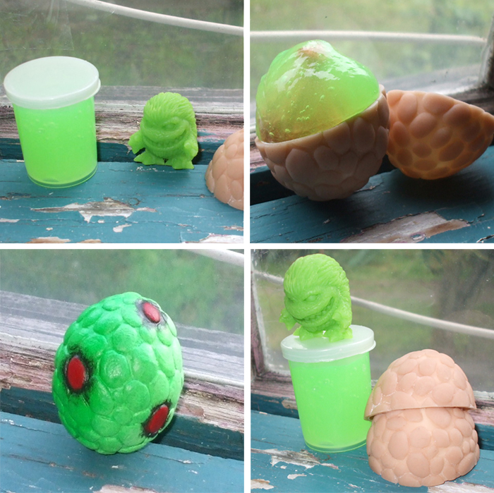 “What happens when you mix a lime green Critter inspired rubber monster with glow-in-the-dark putty goo and a hand sculpted eggshell?!”