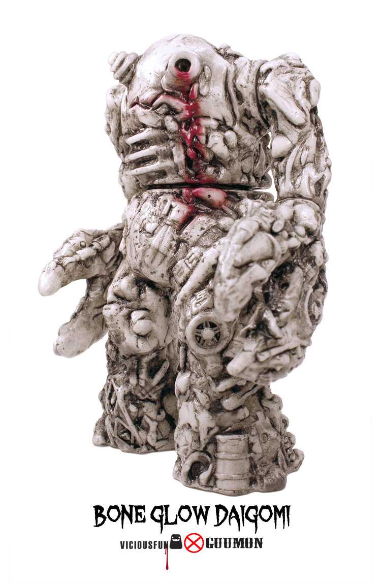 Previewed here as a work in progress a couple of weeks back, Brian Mahony aka Guumon‘s “Bone Glow” Daigomi is finally available in the Vicious Fun store! Standing at a monstrous 8.25″ tall, the super-limited release has been cast in glow-in-the-dark vinyl, coming complete with a stunning black rub and blood stained torso. As mentioned previously, the subtle paint job really helps to bring the sculpted detail out… with the mixture of oil drums, car wheels and body parts gaining a clarity that we’ve not seen in the figure before. Priced at just $89 plus shipping, head over to the Vicious Fun store soon before supplies run out…