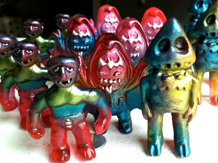 Joining the GR Turtle Tetsujins, Peter has just put the finishing touches to yet another awesome mini-series, the Tasty Rainbows! Featuring three fan favourites, Fright Bite, Kawako and Man-Nie, the figures have been cast in an assortment of clear resins, each coming complete with a stunning mixture of metallic sprays. Priced at $10 each, Peter has stated that there will be just 5 of each character available at the booth… To sweeten the deal even further, Peter has also promised a free Kato/Giant Robot team-up pin with every purchase! Stay tuned for news on Peter’s forthcoming projects soon…
