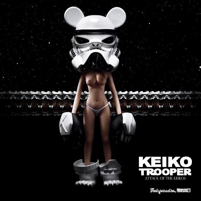 Teased a couple of weeks back (both here and here), Fool’s Paradise proudly present the pre-order for their latest Keiko figure, the Star Wars inspired KeikoTrooper! 100% handcrafted, the exquisite resin pays a loving tribute to the Stormtrooper, featuring the signature oversized Keiko-style head, gloves, bear claw boots and back plate. Cast in two different resins for the armour and body, each part has been meticulously hand painted and joined (including magnetically connected hands!) … Priced at $199 shipped ($219 EMS), the 29cm tall figure will be made to order, with an estimated shipping date of OCT 2012. Head over to the Double Fools blog here to secure yours…