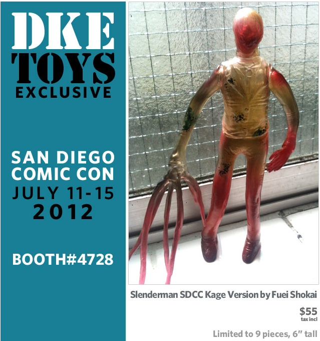 Originally debuting at Superfestival 57, Fuei Shokai are proud to present the latest iteration of Slenderman, the SDCC exclusive “Kage” version. Inspired by the American urban legends of the same name, the super-creepy sofubi has been cast in clear Japanese vinyl with red sprays and a metallic underlay. Limited to just 9 pieces, Slenderman will be available from the DKE Toys booth starting Wednesday night, priced at $55 each…