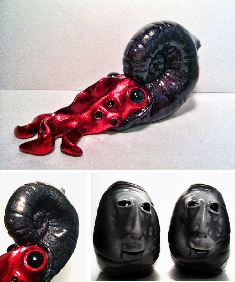 After the sell-out success of the original Topheroy x Mechavirus Ammonaitos (find out more here), the guys have set about working on another batch, aptly titled the Cephaloblood edition! Once again limited to just 4 pieces, the beautiful creatures have been sculpt and cast in resin by Todd (Mechavirus), whilst painting duties have been handed to Topheroy. Coming in a deep metallic crimson with an oily pearlescent shell, the main attraction with these guys has got to be the faces on the rear… the subtle grey highlights, black lowlights and hi-gloss finish really help make these pieces pop! Priced at $75 each shipped, the Cephaloblood Ammonaitos can be purchased directly through Topheroy (or Todd) at topheroy@gmail.com. Check out the Customantics store for more of Topheroy‘s work…