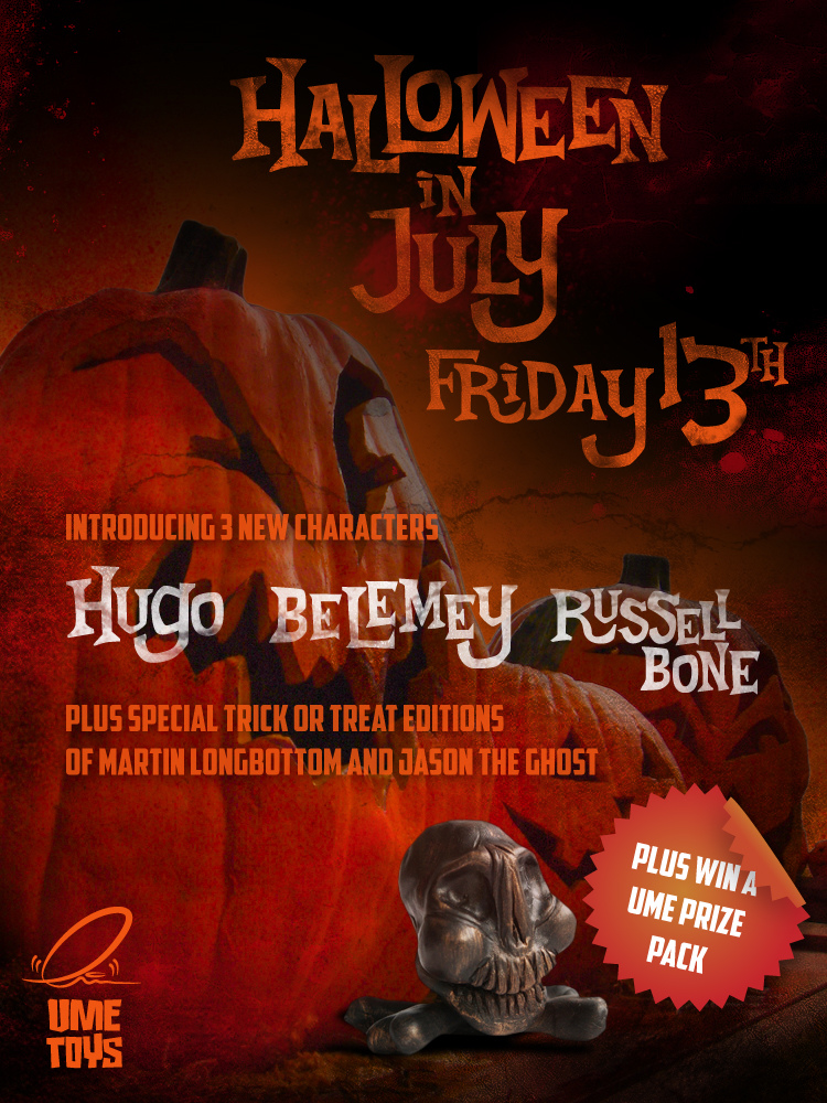 After a solid month of preparation in the UME Toys resin lab, Richard Page proudly presents the full release details for tomorrow’s MASSIVE “Halloween in July” release! Featuring 3 all-new members of the UME family; Hugo, Belemey and Russell Bone, alongside very special editions of both Martin Longbottom and Jason the Ghost, the huge selection of resins will be available in a variety of different editions and one-off customs, including our favourites, the bright orange Cheeky Flockers! Rich kindly gives us the rundown on what will be on offer…