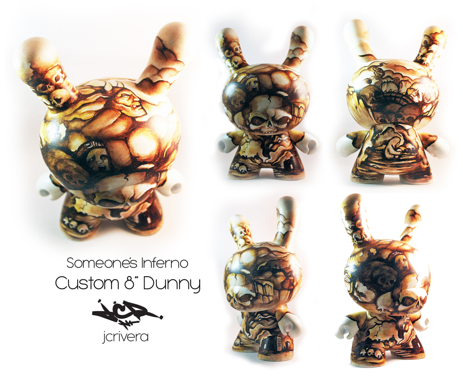 It’s been a while since we last featured any Dunnys at Man-E-Toys, but on catching wind of JC Rivera‘s stunning “Someone’s Inferno” yesterday, we knew we couldn’t pass the little guy up! More art-piece than custom, the beautiful figure has been inspired by computer game “Dante’s Inferno”, which was in turn inspired by the epic 14th century poem, Devine Comedy. Depicting a hellish world full of skulls, lost souls, and of course, Beelzebub himself, the harrowing scene has been painted in Rivera’s signature soft-focus style with a limited palette of browns and yellows… Unfortunately (for us!), Someone’s Inferno was a privately commissioned by a KR Board member, so if you’re interested in acquiring a similar piece, your best bet is to head over to Rivera’s site here with any enquiries.