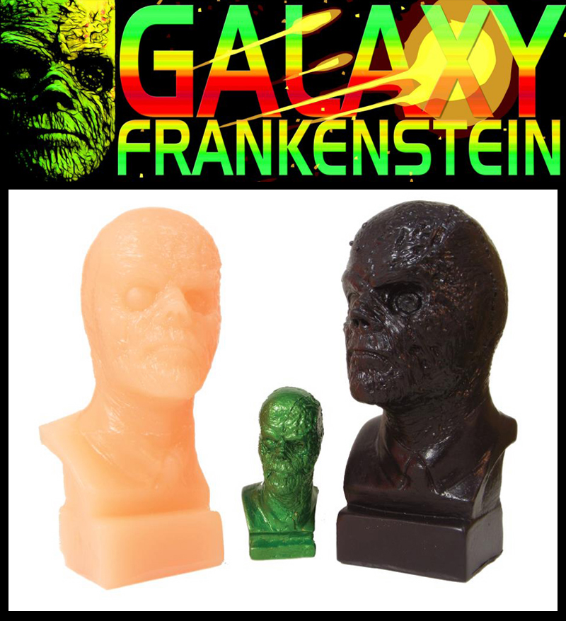 Following in the footsteps of the Skelechubs last month (find out more here), We Become Monsters‘ Galaxy Frankenstein bust is the latest resin to get the “Mini” treatment! Originally created for the Toy Invaderz Show, the classically sculpted monster bust has been shrunk down using a special material (Hydroshrink), and then re-cast in a new 2″ scale. Due to be touching down in the WBM’s store at some point later today, we’re guessing they’ll be available in the same huge selection of opaque, clear and GID tints seen in the previous “Mini” release… Stay tuned for a post update as soon as full release details are revealed later.