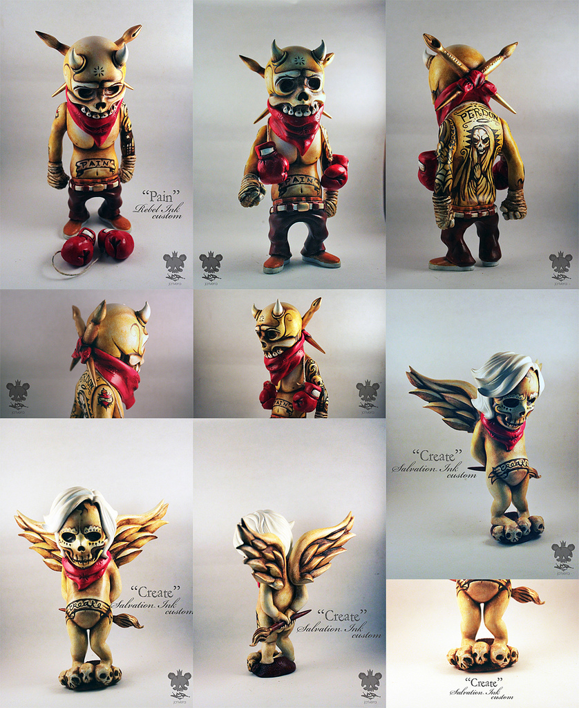Swiftly following the awesome Dante’s Inferno inspired Dunny we featured at the weekend, Chicago based artist JC Rivera proudly presents his latest two customs, entitled “Create” and “Pain”. Using Secret Base’s Salvation and Rebel Ink sofubis, Rivera has gone for a Neo-Traditional approach to the paint work on these guys, infusing a mixture of “Day of the Dead” styled skulls and pattern work with old school tattoo flash. As always, JC has also managed to work his sculpting magic, with the subtle addition of horns and “Bearlee” styled boxing gloves on the “Pain” Rebel Ink and a skull base for the “Create” Salvation Ink really helping to make these gorgeous pieces pop… Unfortunately these guys were created for a private commission, so if you’re looking to score a similar piece, your best bet is to contact Rivera through his site here.