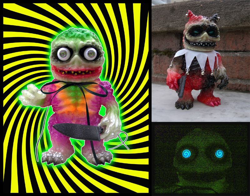 Coinciding with the release of The Dark Knight Rises today, MVH (Mutant Vinyl Hardcore) is proud to reveal his latest DX Dokruo Sludge Demons, the “Psycho Swirl Joker” and “Harley Quinn” chase! Cast in glow-in-the-dark vinyl, Pyscho Swirl Joker has been sprayed in a variety of metallics, fluorescents and clear paints, coming complete with ribbon tie, GID swirl doll’s eyes and knife accessory. Available via lottery over a 48 hour period starting tonight (Friday, July 20th) at 12am EST (click through for entry details), the figure has been priced at $110 plus shipping… With Harley Quinn being so different from the Joker design, MVH has decided to offer her up separately through his store. Once again cast in a GID vinyl, Harley Quinn has been sprayed in a mixture of red and black sprays, featuring a belled jester’s collar and gun accessory. Due to hit the store tonight between 11-12am, the Harley Quinn chase will come with a similar price of just $110 plus shipping.