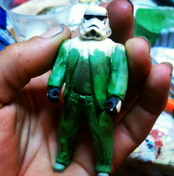 It appears that 2012 will be the year of the Star Wars bootleg at DesignerCon this November, as alongside The Sucklord‘s Super Suck Up! show, 2bitHACK will also be debuting his latest line of mash-ups, Mi Empire Loca. We originally revealed the first figure in the series, Chewbacca Homes, a few weeks back, so it came with great pleasure this week to find the artist has already begun work on the second… a suit wearing Stormtrooper! Featuring a bootlegged action figure, vintage Stormtrooper head and some original sculpting, the piece is due for a purple silicone bath over the next couple of days- so be sure to stay tuned for a look at the first test pulls next week!
