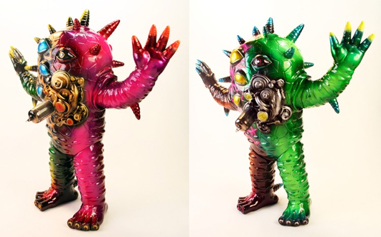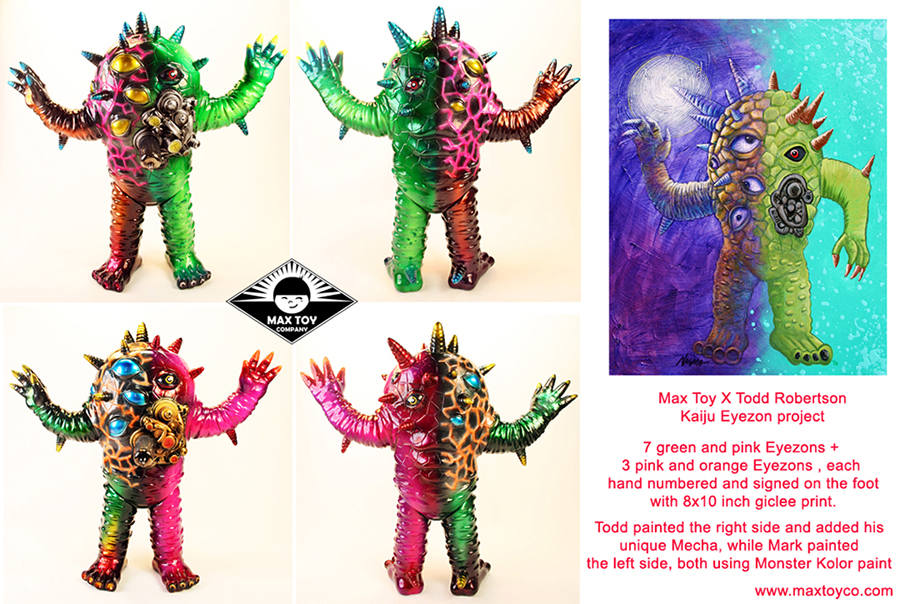 Whilst new toy info has been a little thin on the ground today, the final reveal of the long awaited Max Toy Co x Todd Robertson Kaiju Eyezon project over at Max’s Brain has more than made up for it… Quite simply a match made in custom-kaiju heaven, the highly talented pair have set to work on 10 10.5″ tall Eyezons, each tackling 50/50 each in their signature styles… featuring a mixture of Todd’s incredible Mecha chest plate and metallic colours with Mark Nagata’s meticulous sprays, the Monster Kolor infused pieces are truly a sight to behold… Joining the 10 gorgeous customs (7 green and pink, 3 pink and orange), the duo have also worked on a giclee print in a similar fashion, with Mark tackling the left hand side and Todd the right. Priced at an unbelievable $200 for both print and toy, the set will be available at some point tomorrow (Wednesday, August 8th) through the Max Toy Co store… Anyone interested in checking out the processes behind putting the project together should head over to the Toy Karma blog here for more information.