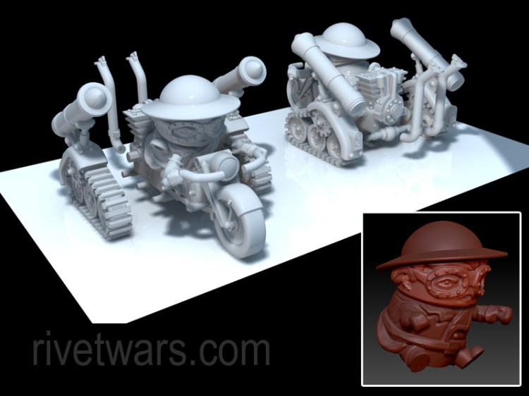With the previously posted MonoWheel now awaiting production after a successful test-print last month, Ted Terranova is proud to reveal the latest vehicle to join the Rivet Wars fight, the Rocket Bike! Shown here in an exploded view, we’re glad to see the multi-part assembly of the Quad Stugs hasn’t put Ted off doing a similarly complex figure… this beast is set to come in 5 different pieces! Judging by the grunt (soldier) design, this will form part of the Allies side, joining the Vert Tank and Quad Stug in the battle against the evil Blight. No news on an exact release date for either the MonoWheel or Rocket Bike, but we have our fingers crossed for a debut at NYCC in October. Stay tuned for more news soon.