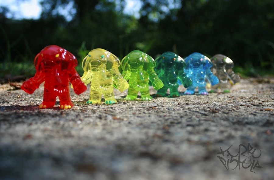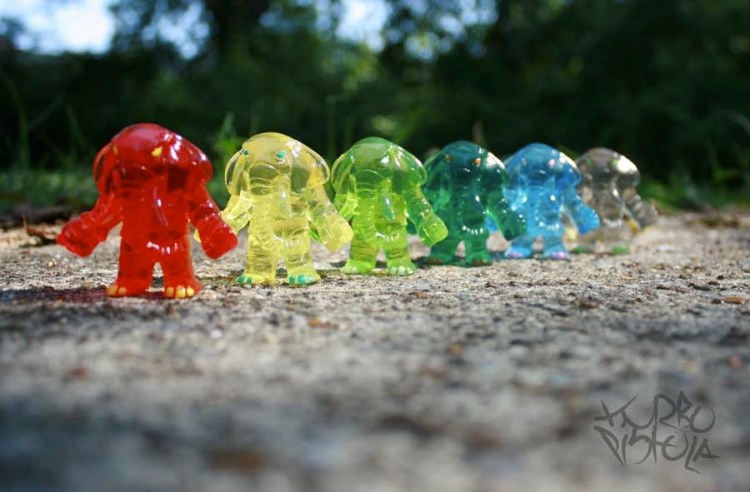 After a brief hiatus, Turbopistola is back once again with another two Elephantos drops, the awesome “Imagination is King” and “Spectra” editions… Cast in a variety of beautiful clear tints including the aptly named Fire, Banana, Sweet Lime, Bottom Feeder, Berry and Smoke Duece, each Spectra Elephantos has been finished with contrasting detailing, and a hearty coat of Monster Kolor gloss for that candy shine! Limited to just 15 (some colours being more rare than others), the figures are due to come bagged with a hand-stamped header for $25 plus shipping… Taking inspiration from childhood memories, the “Imagination is King” Elephantos is the latest to be granted a weapon accessory… this time in the form of a (resin cast) wooden sword! Limited to just 5 pieces this time around (with only 3 available for sale), the figures come with Turbopistola’s signature brushed and rubbed paint job, each with a different coloured band on their pants. Packaged in a custom built lino cut box, the Imagination is King Elephantos will be joining the Spectra’s in the Turbopistola store tomorrow (Monday, 20th August) at 10am Central time for $35 plus shipping…