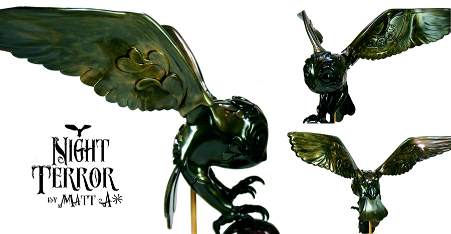 After months in development and production, Matt A*‘s jaw-dropping Night Terror is finally available to pre-order! Hand cast and meticulously finished in an oily colour changing paint, the steampunk infused owl comes in at an impressive 16″ tall, with a monstrous 24″ wing span. Featuring a clear acrylic stand and fully rotating base, Matt A* will also be including the pictured custom skull cast, which fits snuggly in the creature’s claw. Limited to an initial 10 pre-order slots at the reduced price of just $200 (standard price $300), shipping on the figure will commence sometime in December 2012. Head over to the shop here to secure yours, and be sure to stay tuned for the bird’s public debut at NYCC in October…