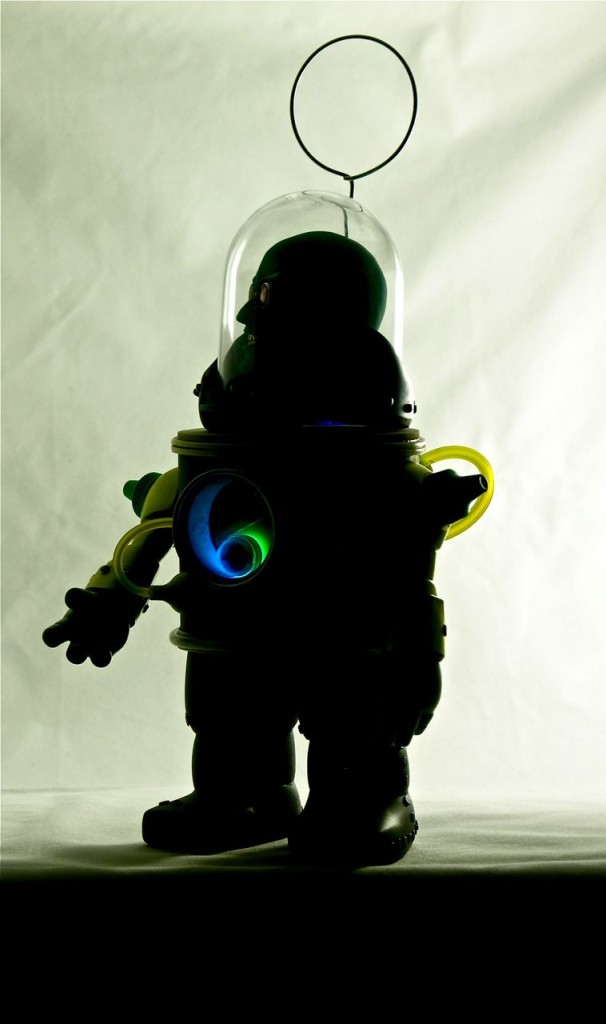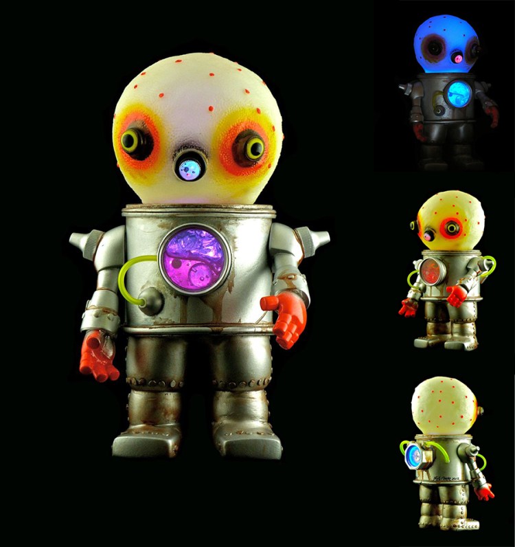 Bob Conge aka Plaseebo kindly shares details of his latest on-going custom series, the ultra limited “Misfits”… Utilising a brand new body sculpt that has been hand cast in resin (which appears to have the chubby hands of a certain marshmallow man!), Plaseebo plans to release 6 of the 9” figures over the next 12 months, each coming in a unique hand paint and featuring a different head from the artist’s extensive back catalog. Taking his love of electronic and moving parts to the next level, Plaseebo has surpassed all earlier efforts with the inclusion of a see-thru body chamber which has been filled with a “magical mix” of slow moving gel colors and shapes, then illuminated from the back by a switched colour changing LED unit that also lights the interior of the head! The first in the series comes in the form of the pictured “Night Gamer” edition… no news on exact pricing for the figure, but Plaseebo informs us that he will be taking him along to his latest one-man show this month at the Phillips Gallery in Rochester N Y… More news as soon as we get it!