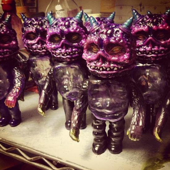 Originally available to attendees of this year’s Wonderfest, Luke Rook over at Lulubell toys has saved 3 of the breathtaking Grody Shogun x MVH Mash-Ups for his legions of devotees! A combination of the infamous “Monster” body and “Sludge Demon” head, the gruesome sofubis have been hand painted in a mixture of purple, green and gold Monster Kolor sprays. As with most of these super limited releases, the figures will be offered up via a lottery for $90 plus shipping. Anyone interested needs to send an e-mail to amy@lulubelltoys.com by Sunday (September 16th) at midnight Pacific Time. The 3 lucky winners will be notified on Monday…