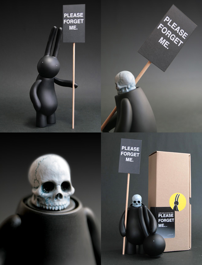 Completing the trifecta of figures in the “petit lapin museum 2012” series, Mr Clement is proud to announce that “Please Forget Me… in black” is now available to purchase. Featuring the much loved Petit Lapin in a black vinyl, the 25cm tall figure comes complete with wooden protest board and removable head. Easily our favourite of the bunch, the black really offsets the skull design to create a much darker tone than previous releases… Limited to 200 pieces, the figure is available to order by e-mail via info@mrclement for just £55 (free worldwide shipping).