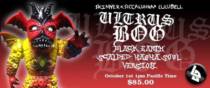 Lulubell Toys are proud to reveal the fifth version of Skinner’s Ultrus Bog, the Black Earth Scalded Magma Soul edition! Coming from the amazing mind of self-taught California artist Skinner, sculpted in Japan by the master Siccaluna, and produced by Lulubell Toys in Japan, the “Black Earth Scalded Magma Soul” version is the the first in what will be an ongoing series of painted runs designed to produce an immense energy of awesomeness when displayed together! Coming hand painted in a firey selection of black, yellow and red sprays, “BESMS” Ultrus Bog will be touching down in the Lulubell Toys store on October 1st (1pm Pacific Time) for just $85 plus shipping…