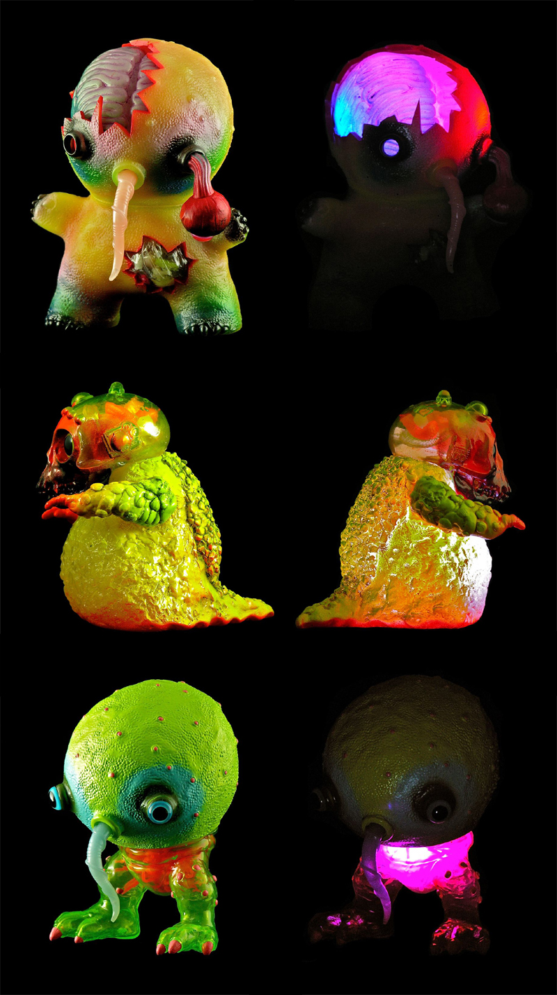 Ahead of the opening of his latest exhibition at the Phillips Gallery this weekend, Bob Conge aka Plaseebo kindly shares with us a trio of customs that will be sitting alongside the various new prints and toys on show. First up we have the “Zombie Night Gamer”… one of our favourite takes on the wonderfully strange NG sofubi yet, featuring an exposed, LED lit brain and “belly bag” filled with slime and glow in the dark guts! The “Skulloctopus Slug” also makes a reappearance after it’s debut at the Netherlands Monster Jam, coming with a new larger body and arm sculpts that have been rotocast in a translucent resin. Finished off in a variety of neon Monster Kolor sprays, Skulloctopus once again comes with an embedded LED unit in the base. Last but by no means least, the “Alien Nightgamer” is the latest kaiju mash-up from the artist. Grafting the Night Gamer’s head onto an undisclosed lower body, the ingenious design also features LED’s lighting the figure in a stunning neon pink… Recent Works is due to open tomorrow at the Phillips Gallery, NY, running right through until October 20th. Head over to Plaseebo’s site here for more info.