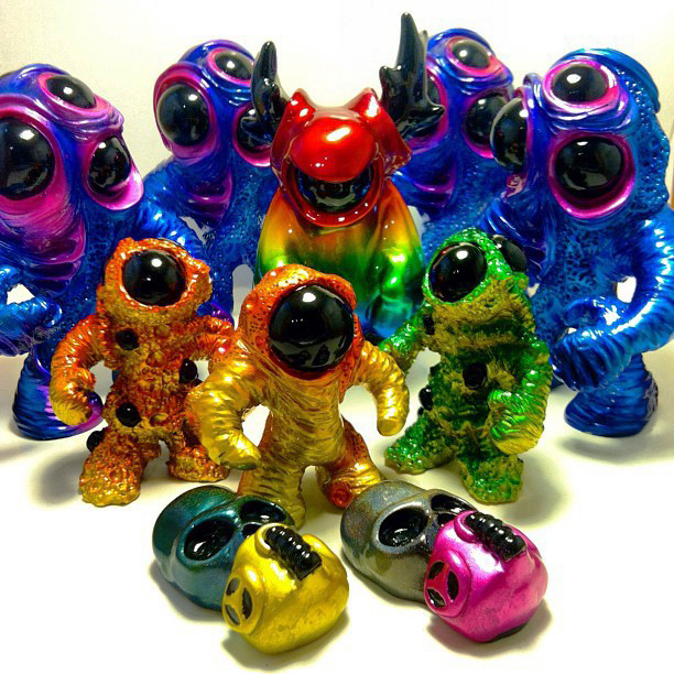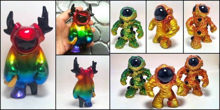 Kaiju custom wizard Topheroy kindly shares details of his latest collaboration with Hellgnome, the Ocu-Lar Beings! Featuring a huge selection of Hellgnome’s latest resin figures including the new Intergalactic Zombie design, Topheroy has given them a full Monster Kolor workout in his trademark mix of metallics and tight black detailing. Due to be touching down in the Customantics store at 2pm EST today (Sunday, September 23rd), the Ocu-Lar beings will be joined by a selection of other Toph kaiju customs… Head over to the Hellgnome Deviant page here to check out more from the ongoing Ocu-Lar series.