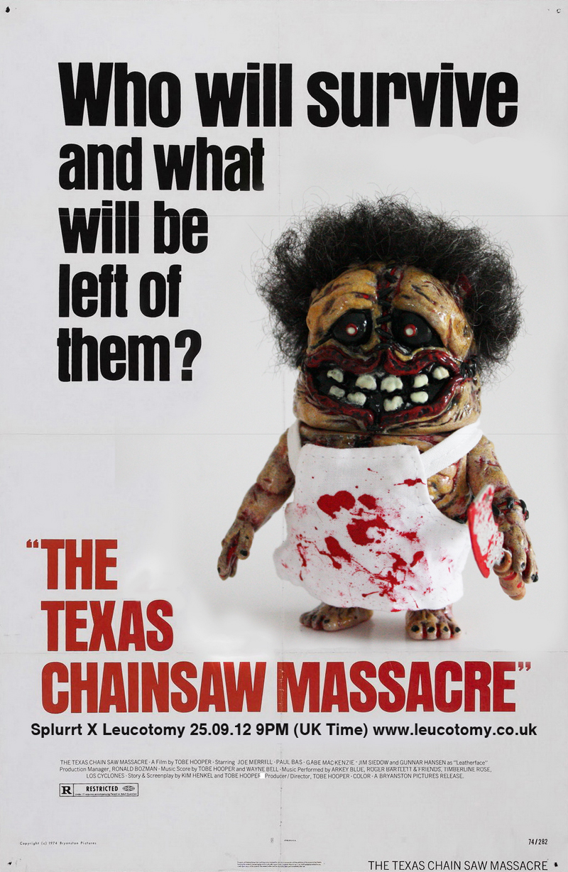 Up and coming artist Leucotomy is proud to present his first collaboration with the mighty Splurrt and Paul Bas… the “Texas Chainsaw Massacre” Cadaver Kids! Limited to just 13 pieces (half of which have already sold in New York), the awesome customs have been hand painted by Bas, each come with a super-creepy mop of hair, blood stained apron, hatchet accessory, plus hand finished screen print and header from Leucotomy! Priced at a very reasonable £50 plus shipping, the TCM Cadaver Kids will be hitting the new Leucotomy site tomorrow at 9pm London time. Stay tuned for more news from this highly promising artist soon!