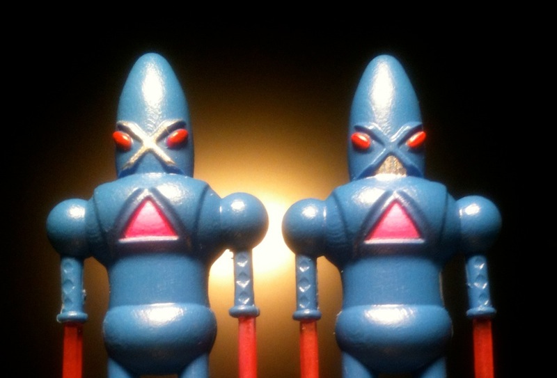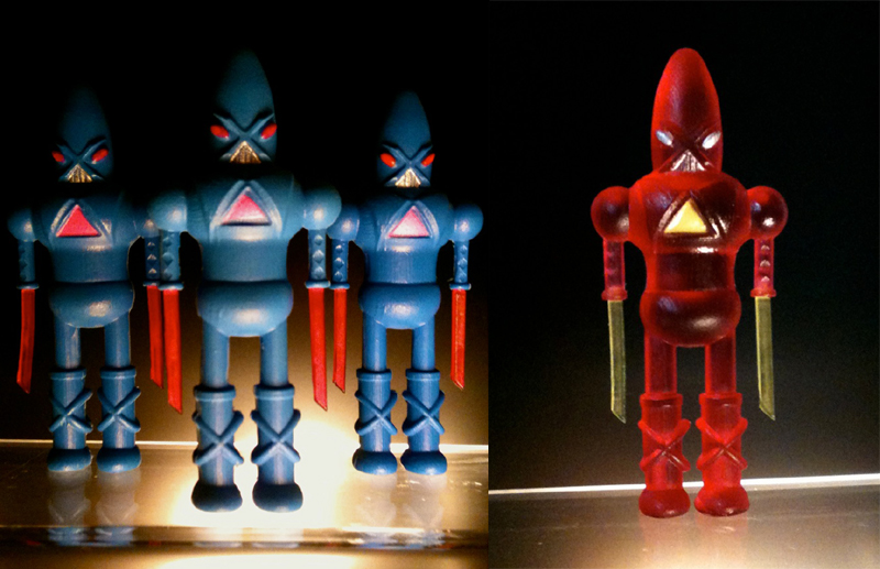 Ninja Robo// Part of the invading Space Army series we featured yesterday, these ninja-robots follow the Tako Cube grunts, and are responsible for exterminating the Tetsujin… The second figure to be sculpted digitally, the awesome 70’s style (with a hint of Star Wars!) robots have been cast in a solid blue resin, armed with twin clear red katana blades. Standing at around 3″ tall, the figures come in 2 subtly different editions, one with a painted mouthpiece (pictured), plus one with a painted face shuriken. Limited to 50 pieces, the Ninja Robos will be available at the Onell Design booth (#3216) and Peter’s online shop for an introductory price of just $20, changing to $25 after the con… Joining the OG Ninja Robo, Peter will also be dropping a con exclusive “Stark” edition too. Coming in the famed gold and red of Marvel’s Iron Man, the awesome looking figure has been limited to 20 pieces, wirth a similar price tag of $20.