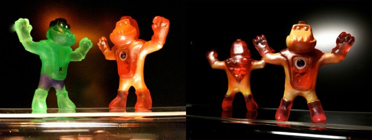 The SMASH Vs. STARK Turtle Tetsujins// Reviving yet another classic Turtle Tetsujin colourway, Peter brings the rather awesome looking SMASH Vs. STARK! Featuring the much loved Hulk inspired design (previously posted here), SMASH, Peter has included everyone’s favourite billionaire super hero Tony Stark aka Iron Man! Coming cast in a clear red resin with yellow and metallic highlights, the figure even features an embedded jewel in it’s chest to represent Stark’s fabled power core… Limited to just 5 pieces each, both SMASH and STARK will be on sale at the Onell Design booth for $20 each.