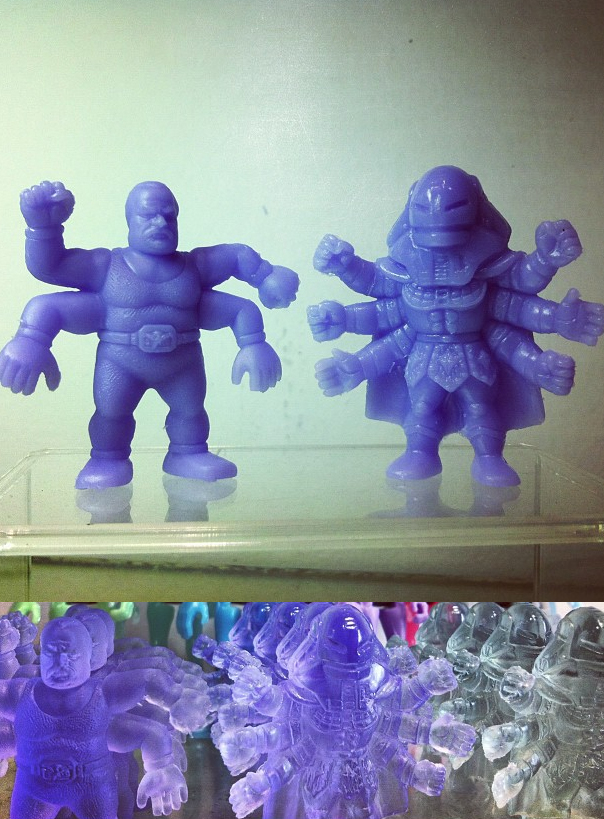 Rounding off a weekend filled with M.U.S.C.L.E customs and bootlegs, we’ve saved quite possibly the best of them for last… the ingenious M.A.S.K x M.U.S.C.L.E customs from Healeymade! Joining the original Venom Ashuraman figure revived from last year, Healey has created a new unmasked variant by kit-bashing Ashuraman’s four-armed sensei with the head of M.A.S.K’s Miles “Wolf” Mayhem (Venom’s leader)! Cast in a mixture of gloss and un-glossed clear purple resins, the mini figure mash-ups will be making their debut at the myplasticheart NYCC booth next week… Fingers crossed for a general release sometime soon!