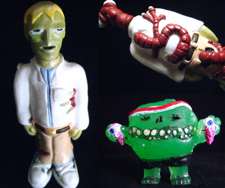 Avant garde resin maestros Rawk Toys kindly share details of there latest slabs of resin genius, with the introduction of Lab Assistant Steve and The Eyeball Snatcher! Sculpt, cast and handpainted by Izok, the seemingly normal looking Steve is more than meets the eye… because upon turning him around, a large parasitic worm-type creature is revealed that appears to be using the poor lab assistant as a host! Coming complete with 2 removable heads (the rather pale looking Steve, plus the bug-eyed worm), the awesome looking figure will be touching down in the Rawk Toy store this Wednesday (October 17th) at 12pm PST… Joining Steve, Rawk’s Skylr will also be dropping his latest creeped-out piece, the strangely cute Eyeball Snatcher. Cast in a clear green resin and finished in a unique ‘loose’ paint style, the sweat-band wearing monster will be touching down at the same time as Steve for a undisclosed price. As well as the joint release, Wednesday will also see the start of the Rawktober promotion over on the Rawk Toys store, whereby the guys will be giving away a special Trick or Treat bag with each and every purchase- sweet! Stay tuned for more Rawk madness soon…