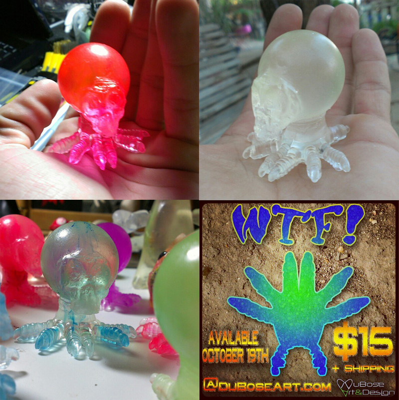 As promised last week, we bring you yet another sweet looking resin from the DuBose A&D camp, this time in the form of the super-freaky WTF! Chickens… Featuring a creeped-out mix of chicken claws and bulbous skulls, the terrifying minis have been hand sculpt and cast by DuBose A&D’s Jonathan in a variety of one-off colourways including opaques, clears, marbles and even a few glow-in-the-dark! Due to go on sale alongside the previously posted Blops this Friday (October 19th) on the DuBose store, the WTF! Chickens will come priced at just $15 each. Stay tuned for more from DuBose Art and Design later this week!