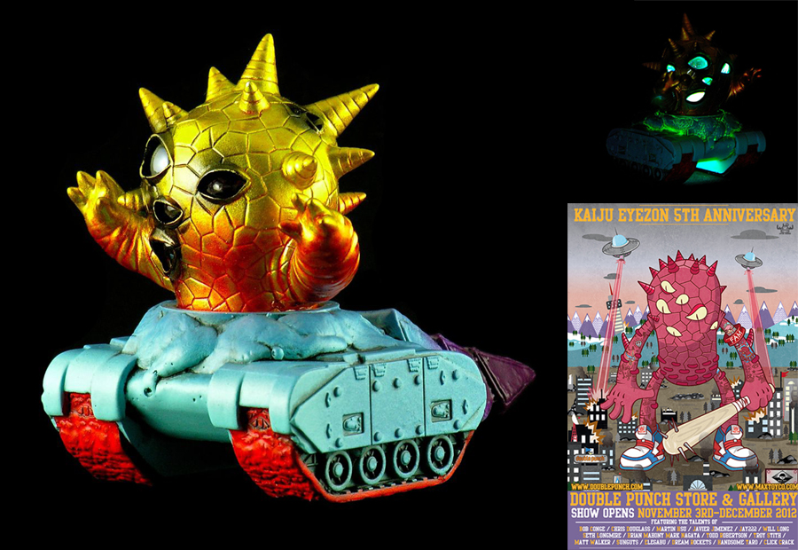 Bob Conge aka Plaseebo kindly shares details of his piece for the upcoming 5th Anniversary Eyezon show at Double Punch, the jaw-dropping Eyezon Tank! Once again infusing both resin and vinyl mediums, the awesome piece features the beloved Eyezon sat inside Plaseebo’s hand-cast tank design, coming complete with cut out glass eyes and a colour changing LED unit that illuminates them in the dark! Finished in a tight selection of metallic Monster Kolor sprays, the signed and numbered piece will be sitting alongside a whole host of customs from kaiju’s finest come the show’s opening on November 3rd… Head over to the Double Punch site here for more info.