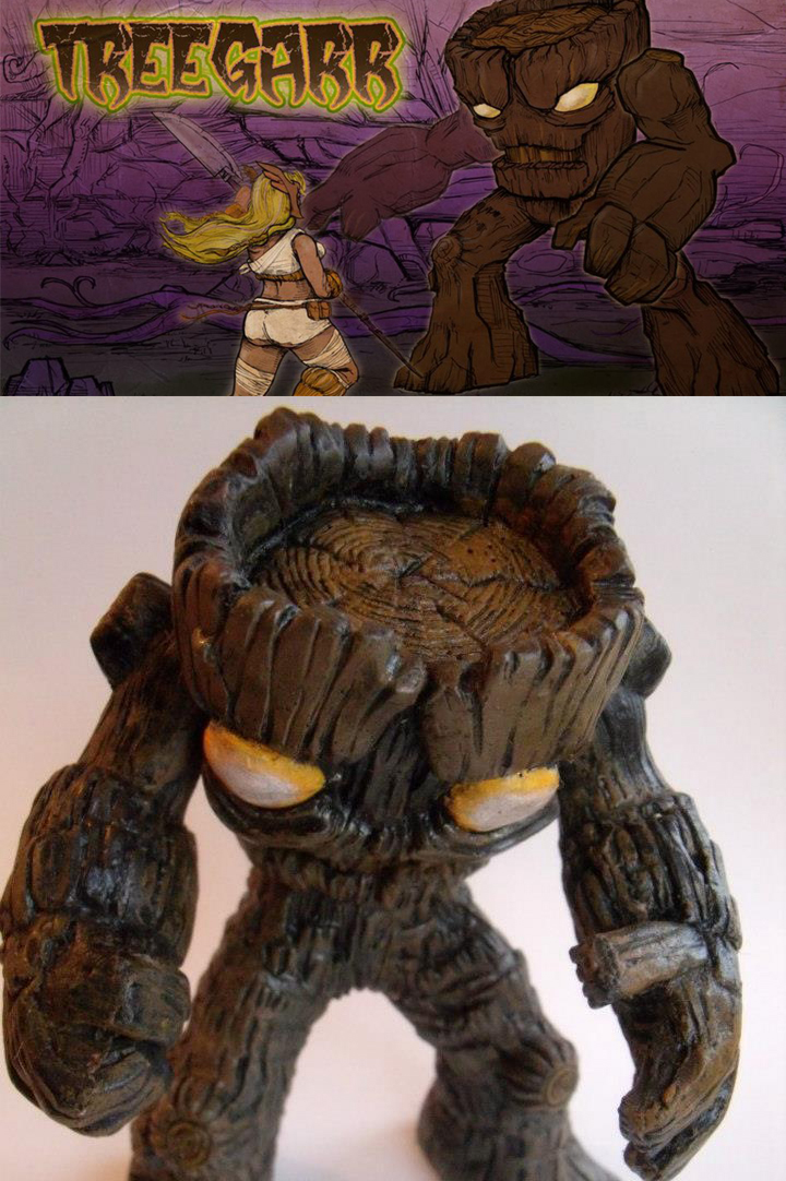 “Born from the blood of centuries of sacrifice in a far off desolate wasteland, ‘Treegarr’, known also in ancient tongues as ‘Treevil’, needs blood to remain animated. If starved, he must lay root and remain dormant until blood spilt by evil allows him to awake again… Although Treegarr is only one entity, and one evil mind, there are many stories of him from across this universe and others. Farmers, knights, barbarians, and lesser monsters all have folk tales of this being. Here then, is his true form…”