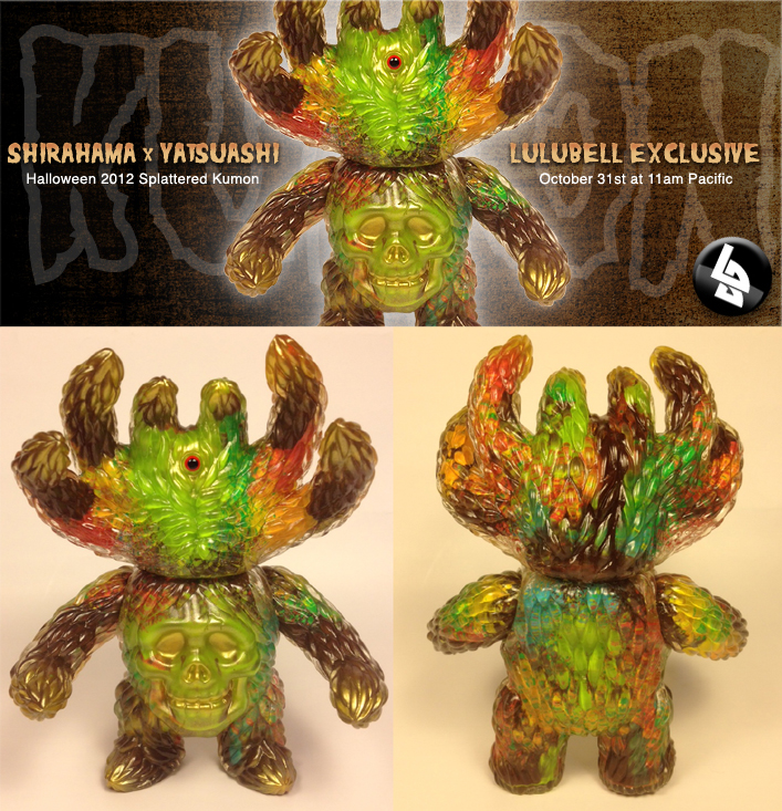Always going the extra mile to appease their legion of loyal fans, Lulubell Toys have only gone and secured one of Shirahama’s most sought after kaiju figures, the mighty Kumon… in an exclusive Halloween 2012 “Splattered” colourway no less! Designed by Yatsuashi and sculpted by Kiyoka Ikeda of Gargamel, the spider monster has been cast in a super clear soft vinyl, which has been painted from the inside and finished up with spray detailing on the outside as well. Standing at 4″ tall and coming with one point of articulation, Splattered Kumon will be dropping in the Lulubell Toy store tomorrow (October 31st) at 11am PST for just $50 each.